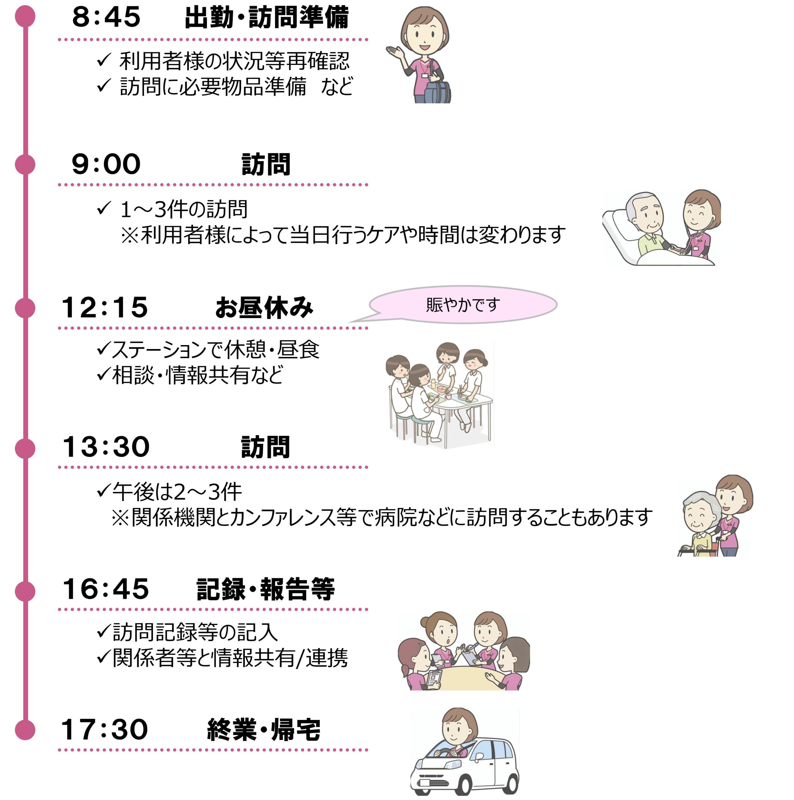 花みずきでは、毎日事務所に来る必要がありません。家から訪問先に向かい、そしてその日の最後の訪問後は、そのまま帰宅できます。